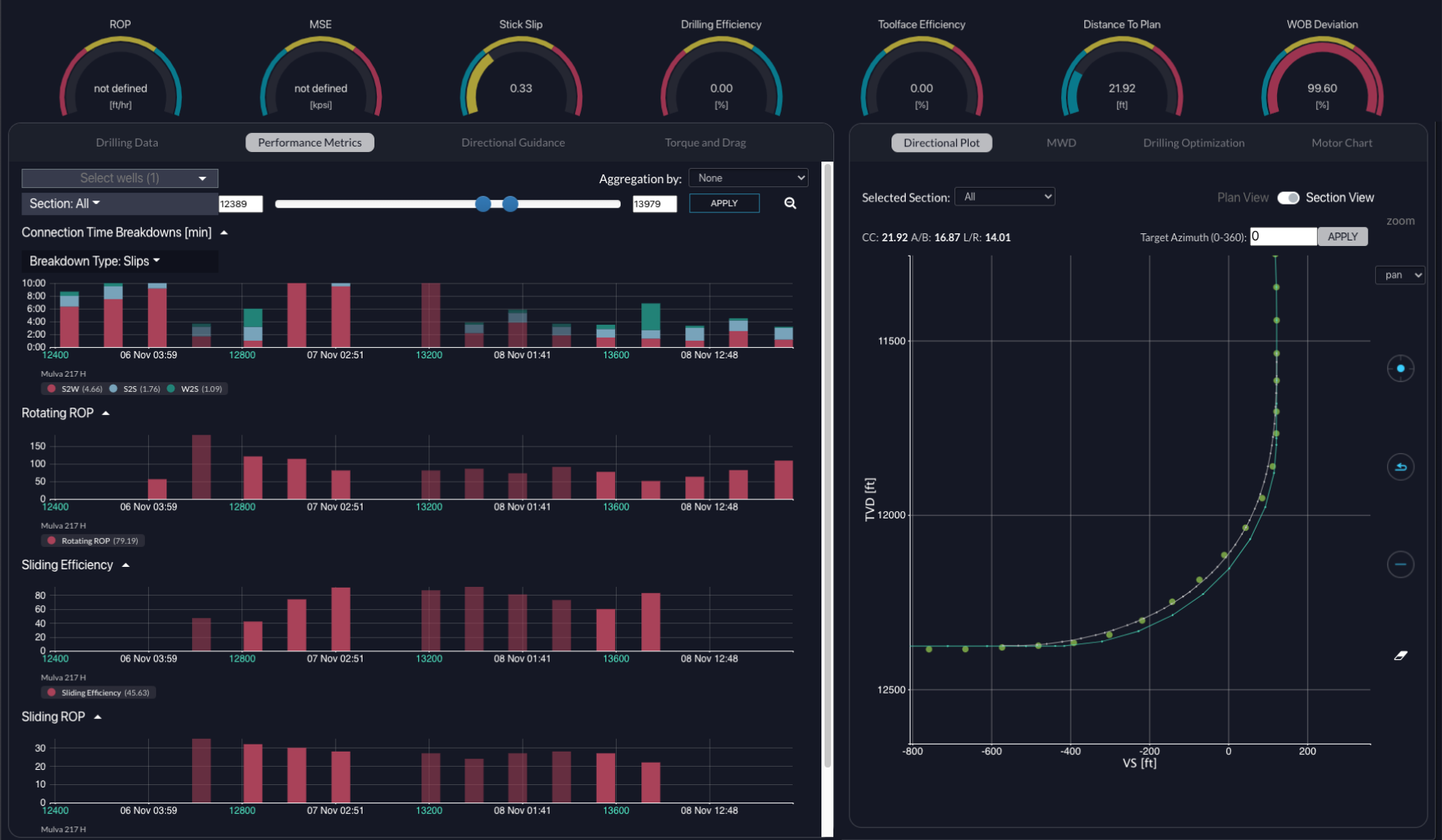 Indicadores de desempeño de la perforación direccional como la eficiencia de la perforación con deslizamiento y las tendencias del BHA.